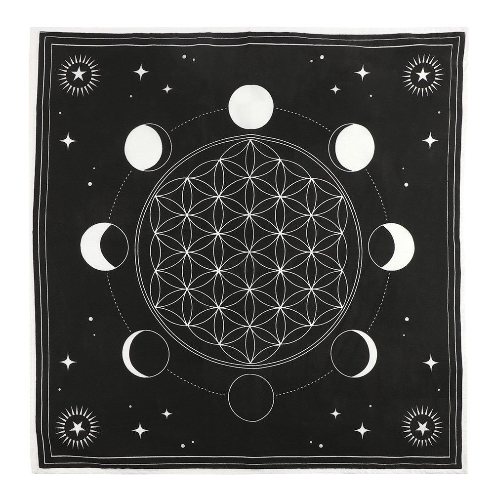 Channel the powerful energy of crystal healing with this cotton altar cloth with printed moon phase design and Flower of Life crystal grid printed in its center.